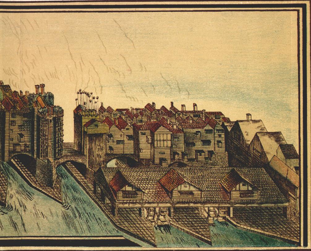 The bridge was built from 1176 to 1209. The Middlesex side is on the left, the Surrey side on the right. For a long period it was the only bridge across the Thames in London. On the Surrey side heads of traitors were stuck on poles above Southwark tower, and may be seen in the drawing. Parts of the bridge were continually collapsing, due to inadequate maintenance. Revenues for its upkeep, derived from toll charges, rents etc., were usually appropriated for other more frivolous purposes. Henry III is reputed to have given all the revenues to his wife to spend as she pleased. In the fourteenth century five arches fell into the river after a particularly hard winter. The bridge was finally abandoned by the Victorians, being deemed beyond economic repair.