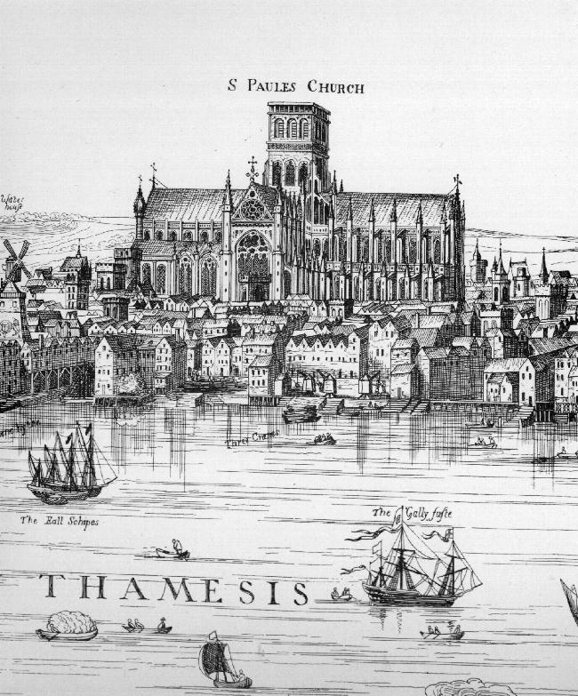 From Visscher's Panoramic view of London circa 1616. The ships in the foreground are the eel ships, and the Galley fuste(?). The church lost its steeple in 1561. It was later burned in the Great Fire of London, and replaced by the present St. Pauls, designed by Wren. Beneath St. Paul's is the Three Cranes wharf. The three cranes are just visible. To the left of them is Queen's Hythe, another wharf. The windmill centre left sits on top of a building with a coat of arms on it, and is part of the Water House, no doubt used for pumping water.